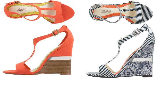 From left to right: Mapleton t-strap wedge in orange and Mapleton printed t-strap in Navy/Cream.