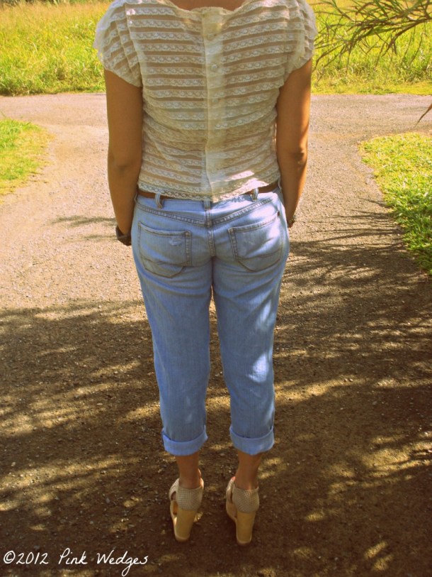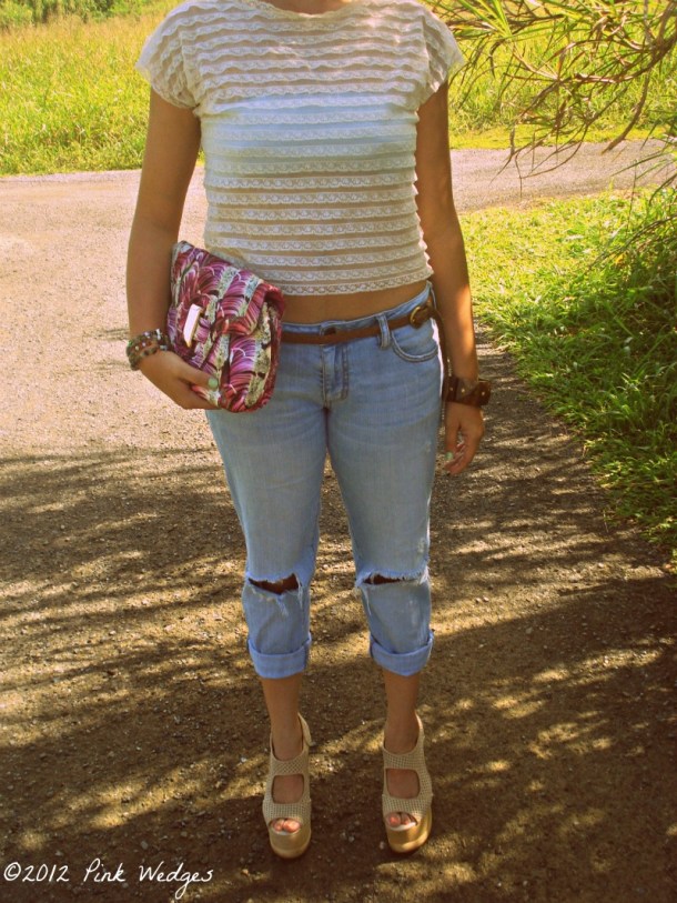 I can’t believe I did it. I’ve been blogging for almost two years and I’ve never done an outfit post. Shocker! Since the blog has been growing I decided that it was finally time to jump on the outfit post bandwagon. Still, I decided to chop my head off so you can focus on the outfit and not my face or hair. In reality I’ve been having bad hair days due to my lack of effort in brushing my hair while it’s curly. I’ve been brainstorming on this outfit since Saturday. It was a rainy Saturday and I decided to wear my ripped boyfriend jeans with my leopard print rain boots. I looked like a hobo so I thought “how can I make this pair of jeans look less boyfriend and more girlfriend-ish?”. Make everything else feminine of course. Enter lace cropped top, denim bandeau, supah dupah platforms, and bold print clutch. BTW I would also like to say that it’s a coincidence that I’ve created a ripped denim related post the same week that other bloggers have written about it. As I wrote before, I’ve had this in mind since Saturday afternoon. Don’t hate.
