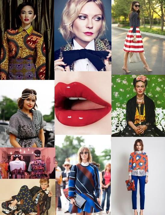 This week’s pin collage is looking directly into the future’s eyes with a little inspiration from the past (See kids, WAY before Lana del Rey, there was Frida Kahlo). I call it “Crazy Prints with Red Lipstick, please”. Both trends are continually growing and are showing no signs of fatigue. I think everybody’s okay with this. Nothing shows more self confidence and power than wearing both together, don’t you think?